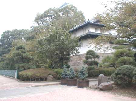 上の写真は大手門に向かって左側。これは右側だ。中央の瓦屋根の建物は郵便局である。 外観を少しでもお城に合わせようとしたらしい。 |