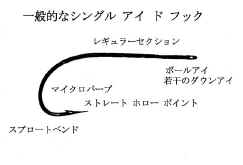 | これらは部位の形ではなく、深さ・幅で表現される。 広すぎても、深すぎても、 ポイントが曲がり易くなってしまうので、シャンクの太さや、 シャンクの断面、はたまたベンドの形とも 密接な関係がでてくる。 ゲープが広過ぎてもファールフッキングを誘ってしまう。 スロートが深すぎるても魚へのダメージが 大きすぎてしまう。 |