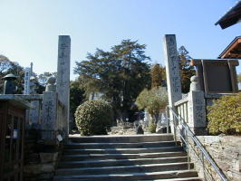 このお寺は、流水岩の庭と社会福祉施設の常楽園、本堂前のあららぎ(イチイ)大師、そして本尊弥勒菩薩が有名です。境内への石段は自然石を削つてできたものです。 |