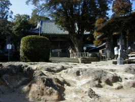 流水岩の庭 流水岩の庭、アララギの古木、本堂、大師堂が並び立ちます。 流水岩の庭は凹凸がありとても歩きにくくなっています。 |