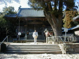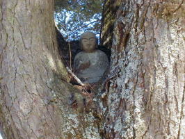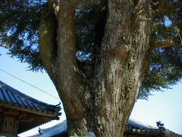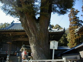 あららぎ大師 本堂前のあららぎの古木は、大師が老人に霊木を挿し木したものだといわれいます。 木の又には、お大師さまが坐しています。 |