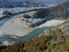ロープウエイより風光明媚な那賀川、田野橋を臨む。那賀川は、カヌーのメツカで全国的に有名だそうです。(案内) |