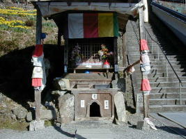 霊水 本堂の石段下にある霊水が寺の宝物だ。大師の掘った井戸から白い水が湧き、どんな日照りにも枯れることがなく、万病に効くのだ。「白水の井戸」とも「弘法の水」とも呼び、地元ではこの水で病気が直ればよだれかけを、腫れ物が直れば松かさを、地蔵尊に備える習慣になつている。(太陽) |