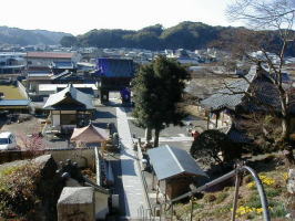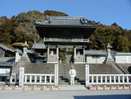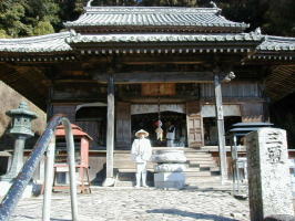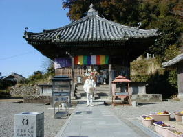 山門 本堂は小高い山の中腹にあります。弘法大師はこの地で修行中に薬師如来を感得し、自尊像を彫刻して本尊とし、人々を平等に救うために寺号を平等寺としました。境内には、万病に効くという白水の井戸があります。 |