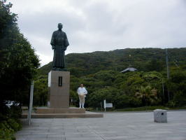 「中浜万次郎の銅像」 第38番金剛福寺は、四国最南端、足摺の付け根にあります。山門を出て、道路を挟んで岬の突端まで続く遊歩道の途中には、ジョン万次郎像があります。 |