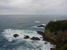 「足摺岬」 雨風が吹きつける展望台から見下ろす足摺岬は、その昔、観音さまのおられる補陀落浄土がこの海の彼方にあると信じ、「あの世」をめざす捨身行(入水往生)がおこなわれた聖地です。打ち寄せる波が岩にあったって打ち砕ける様は雄大絶景です。 |