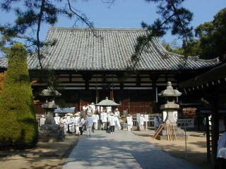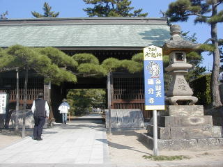 「本堂」 聖武天皇の勅令で建立された国分寺のひとつ。行基を開基として756年(天平勝宝8)に完成、弘法大師が霊場に定めた。 松林のなかに創建当時の伽藍の姿をしのばせる金堂・七重塔などの礎石48個がのこり、全域が国の特別史跡。金堂は間口7間もあったと推定されている。 本堂は、現存する全国の国分寺の建物でも最古のひとつである。本尊木造千手観音立像は高さ5m余で秘仏。また、奈良時代じゅ造という銅鐘には伝説が多い(いずれも重文) (「週刊 古寺をゆく」) |