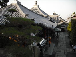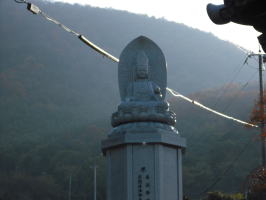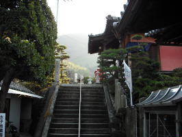 「本堂」 背後に並ぶ5岳の主峰・我拝師山の北麓にある。 弘法大師7歳のころ、師と崇める釈迦如来に会う願をかけ、山頂から谷底へと身を投げた。と、釈迦如来が出現、大師は天女に抱きとめられたという。感激した大師は一寺を建立、釈迦如来を刻み本尊とした。 その後、寺は麓に移され、もとの寺は奥の院となった。捨身ケ嶽禅定という山岳仏教の行場である。現在の境内には捨場ケ嶽遥拝所があり、大師の奇跡を伝える石碑が建つ。境内からは讃岐平野、瀬戸内海を一望できる。 (「週刊 古寺をゆく」) |