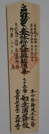 | 大峰山は、吉野山から熊野へ南北約150qにわたって連なる峰々の総称で北部の主峰山上ヶ岳(標高1719m)は山岳宗教のメッカで今もなお女人禁制の続く修験道の山です。大峰山は、修験道の開祖、役行者が開いたと伝えられる修験道第一の霊場で、この大峰山系を縦走するのを「大峰奥駈」といい、この奥駈には、「七十五靡」と称す行場が設けられています。本山派(天台寺門宗)は、熊野から吉野の順峰をとり、当山派(真言宗)は吉野からの逆峰をとり修行を行っています。 この「七十五靡」を本山入峰の順序に従つて述べると次の通りです。 1.證誠殿、熊野本宮大社、熊野座神社2.那智大社3.新宮速玉大社4.吹越山5.大黒天岳6.金剛多和7.五大尊岳8.笹尾辻岸の宿9.水呑宿10.玉置山(1076.4M)11.如意宝珠岳12.古屋宿13.香精山(1121.5M)14.拝返し15.菊ケ池(地蔵岳)16.四阿宿17.檜が宿18.笠捨山(1352.3M)19.行仙岳(1226.9M)20.怒田宿21.平治宿22.持経宿(1081M)23.乾光門24.涅槃岳(1375.9M)25.般若岳26.地蔵岳(子守岳1464M)27.奥守岳28.前鬼三重滝29.前鬼山30.千草岳31.小池宿32.蘇莫岳33.二ツ岩34.千手岳35.大日岳(1595M)36.五角仙37.聖天の森38.深仙宿39.都津門40.釈迦岳(1799M)41.空針岳42.孔雀岳43.仏生岳44.楊枝宿45.七面山46.舟の多和47.五鈷峰48.禅師の森49.菊の窟50.明星ケ岳51.八経ケ岳(仏経ケ岳1914M)52.古今宿53.頂仙ケ岳54.弥山55.講婆世宿56.石休宿57.一の多和58.行者還岳59.七曜山・国見岳60.稚児泊61.弥勒岳62.笙の窟63.普賢岳64.脇の宿65.阿弥陀ケ森(女人結界)66.小篠の宿67.山上岳(湧出岳)68.浄心門69.百丁茶屋(ニ蔵の宿)70.愛染の宿71.金峰明神(金の御嶽の社)72.子守神社(水分神社)73.吉野山74.丈六山75.柳の宿 奥駈峰中は、石につまずき、木に頭を打ち、倒木を跨ぎ、またはその下をくぐり、岩石によじ登り、または鎖や木の根をつたつて降りる険阻な山道が続きます。この霊山大峰修行を無事満行する事が出来ました。 |
