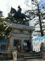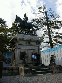 青葉城跡から仙台市街を望む 仙台の街は2001年に藩祖伊達政宗公が1601年(慶長6年)1月11日に「仙台城下屋敷割」を行ってちょうど四百年という大きな節目の年を迎えました。 青葉城跡は仙台駅から西に4Kmほど離れた山中で青葉城跡の石垣は修復中でしたが、政宗公騎馬像のある高台から仙台市街を一望でき、その先には太平洋が望めます。 |