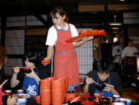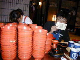 東家駅前店(わんこそば) 「はい どうぞ。」 「はい どんどん。」 「はい がんばつて。」 「はい どつこい。」 「はい まだまだ。」 4人で、250杯。 腹ごなしにカラオケに行きました。 (證明書がもらえます) |
