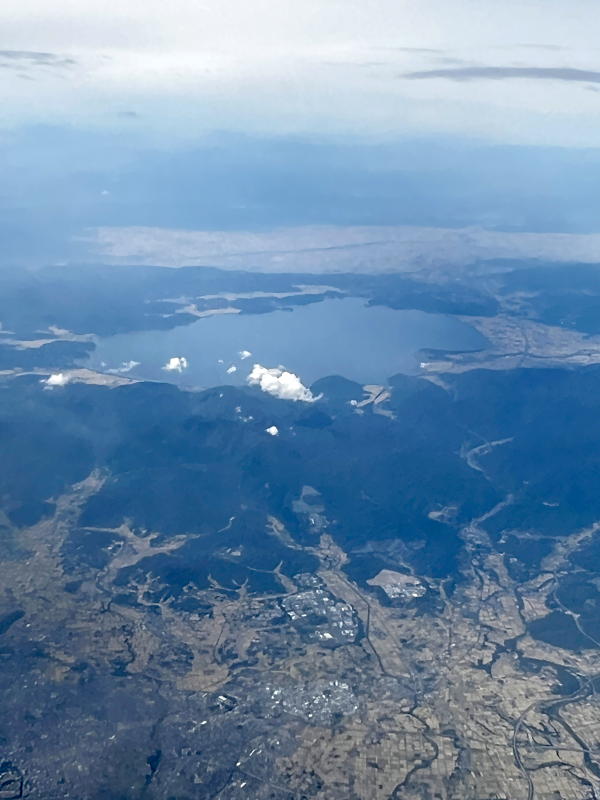 飛行機の窓から撮った、猪苗代湖?の写真です