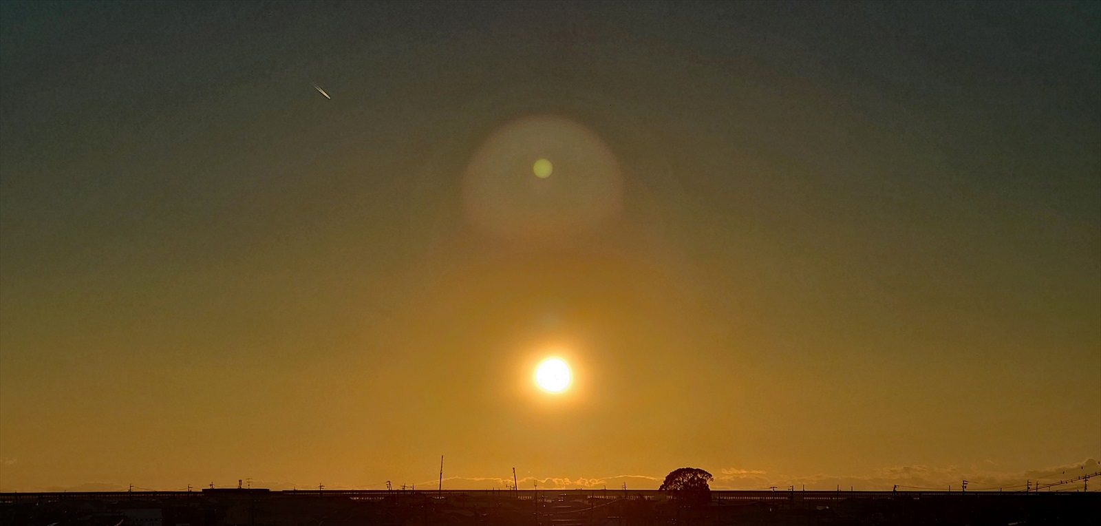 昨秋のほうき星、その後年明けにも、と情報から、先週待ち構えてみましたが見られず終い。太陽の沈む位置確認でスマホ撮りしていたら、ほうき星(ジエット雲)と双子の太陽みたいなのがパチリできました。