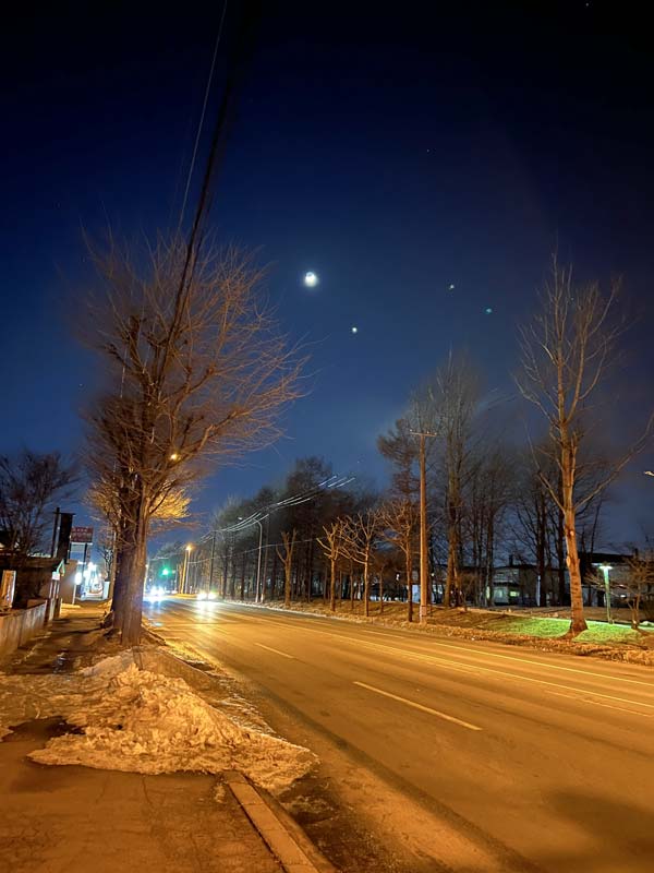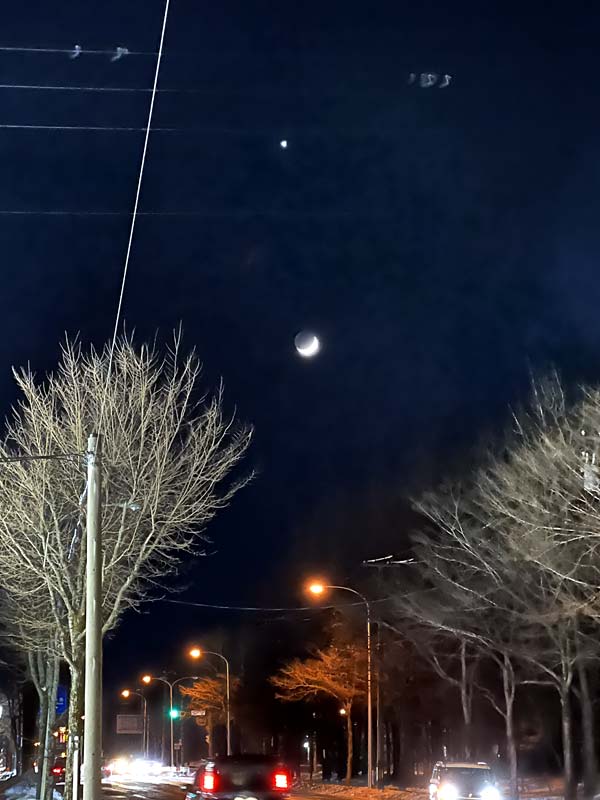こちらスマホで撮った、三日月と金星の写真、1月3日に撮ったものです。月と金星がもう少し近いと、月星のゴム長靴のマークになるのかも…
