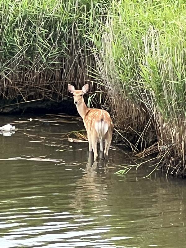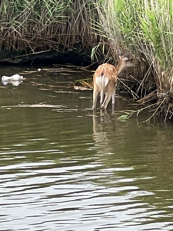 釧路川にエゾシカがいました。湿地を流れている川で、川底はもっとぬかるんでいるのかなぁと思いましたが、そんなことはないようですね。